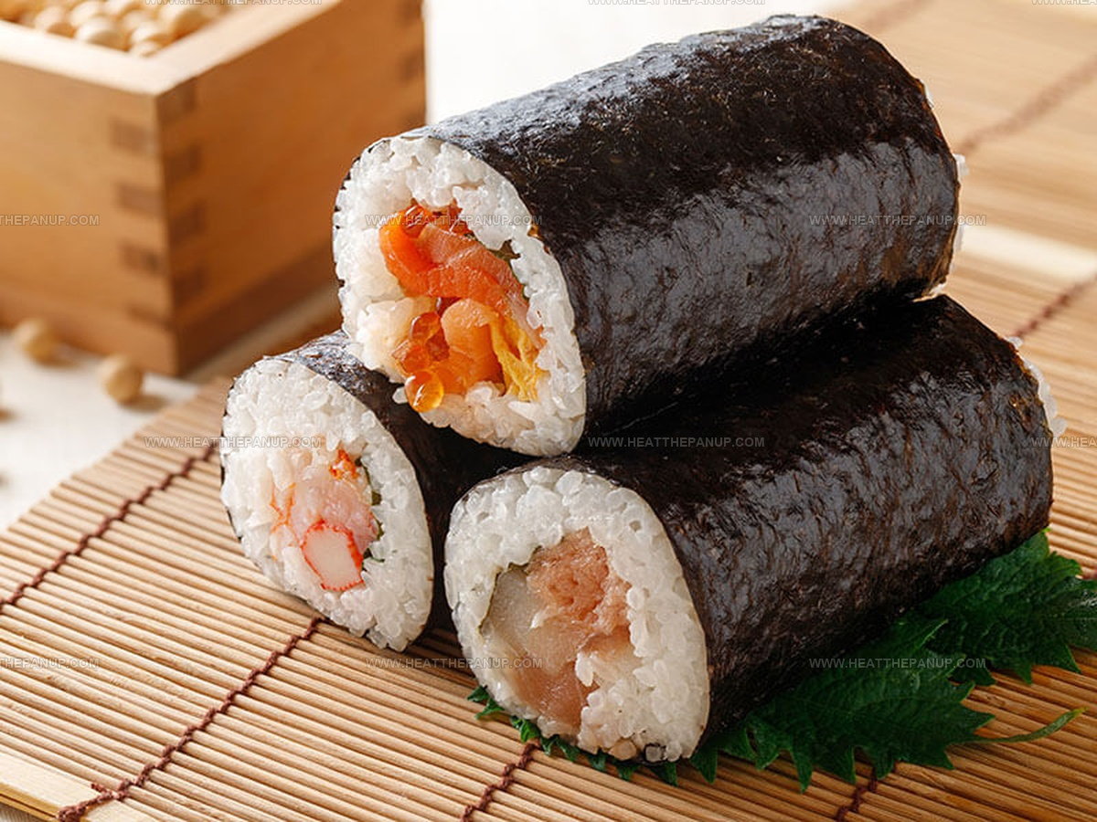 Large rolls about 2 to 2.5 inches (5 to 6 cm) wide, with more than 2 fillings wrapped in seaweed. These rolls are hearty and packed with ingredients.