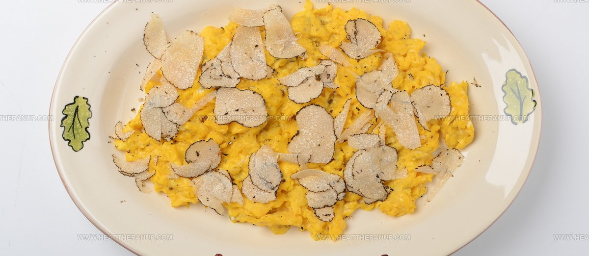 Thin truffle shavings elevate simple beaten eggs cooked in hot olive oil into an exquisite breakfast specialty.