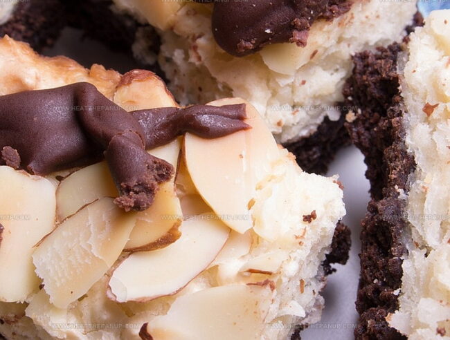 - Distribute sliced almonds over the coconut, arranging them to ensure each bar will have a delightful nutty crunch.
