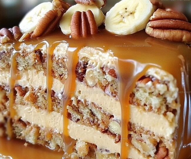 Indulgent banana pecan caramel layer cake delivers southern comfort with rich, golden layers dripping with buttery caramel. Rich pecans and banana sweetness mingle in each luxurious bite that promises pure dessert bliss.