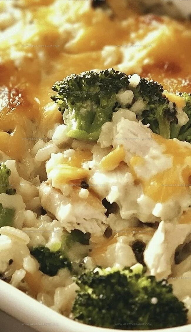 Serve hot as a comforting and hearty meal that combines chicken, rice, broccoli, and cheesy goodness.