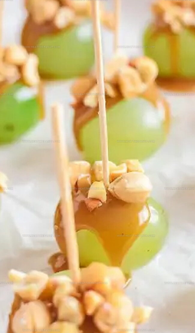 - Immediately transfer the caramel-drenched grape into a shallow dish filled with finely chopped roasted peanuts, gently rolling to create a crunchy, textured exterior that adheres seamlessly to the caramel layer.