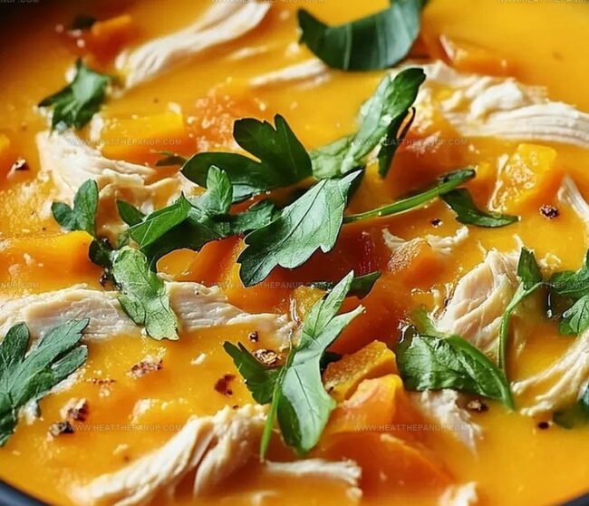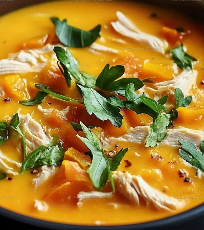 Rich, velvety broth cradles tender chicken pieces and sweet roasted squash in a delightful dance of flavors.