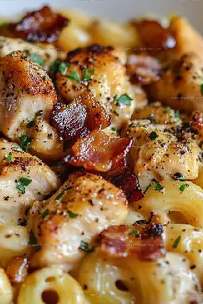 Tender chicken pieces create delightful protein-packed bites throughout each cheesy forkful.