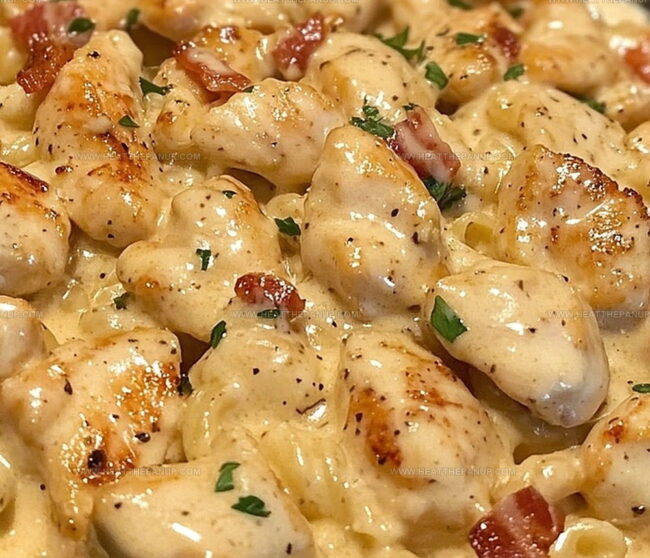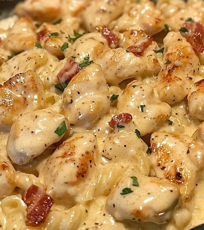 Crispy bacon pieces add a smoky crunch to the tender chicken and perfectly cooked pasta.