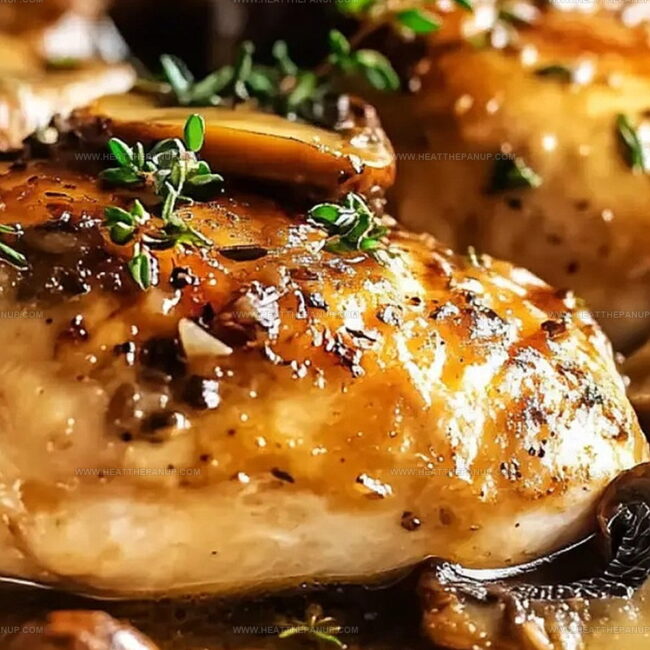 - Reintroduce the seared chicken into the skillet, coating each piece thoroughly with the luxurious mushroom sauce.