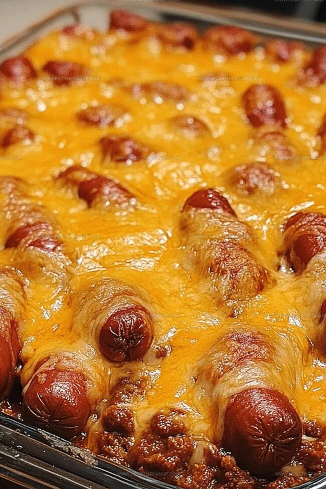 Juicy hot dogs nestled between zesty chili and melted cheese make this dish irresistible.