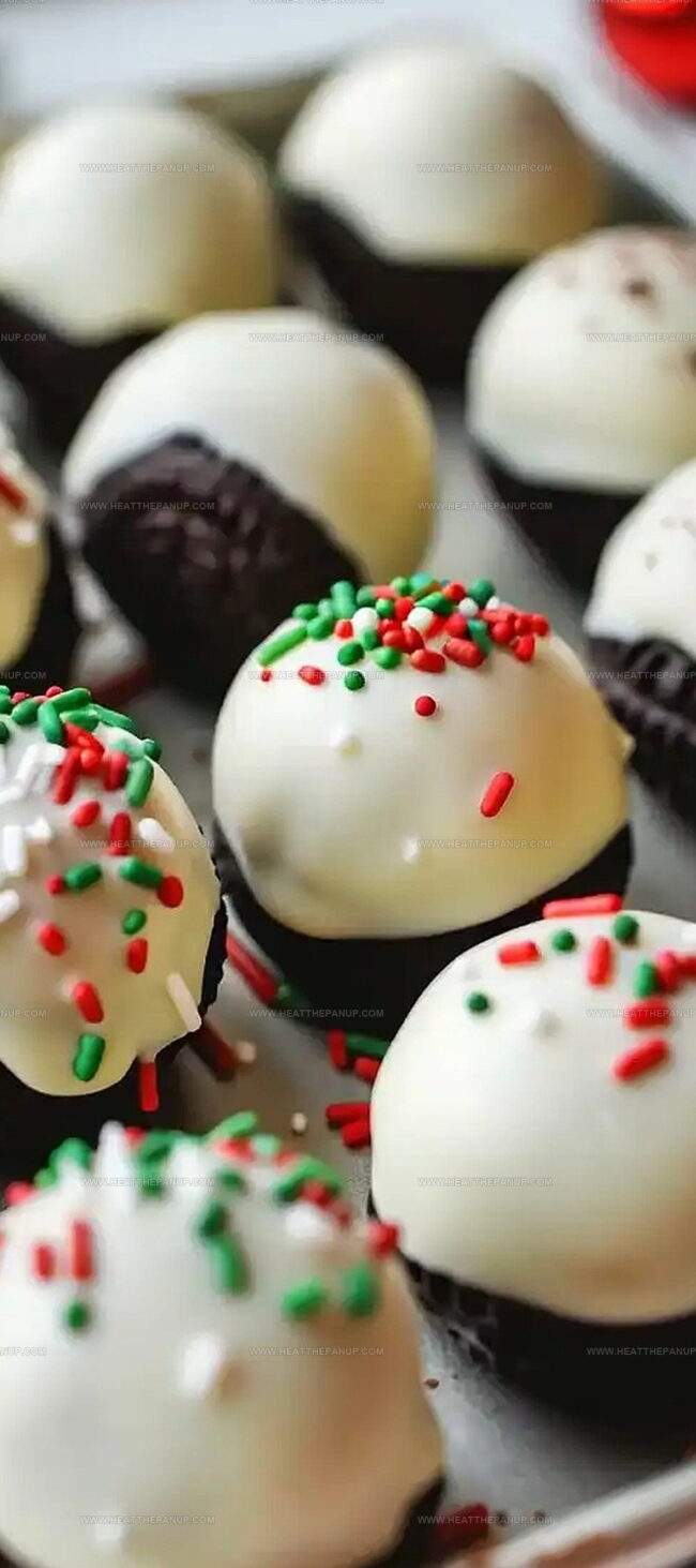 - While the chocolate remains liquid, embellish the truffles with festive red and green holiday sprinkles or finely crushed candy canes, creating a vibrant seasonal aesthetic.