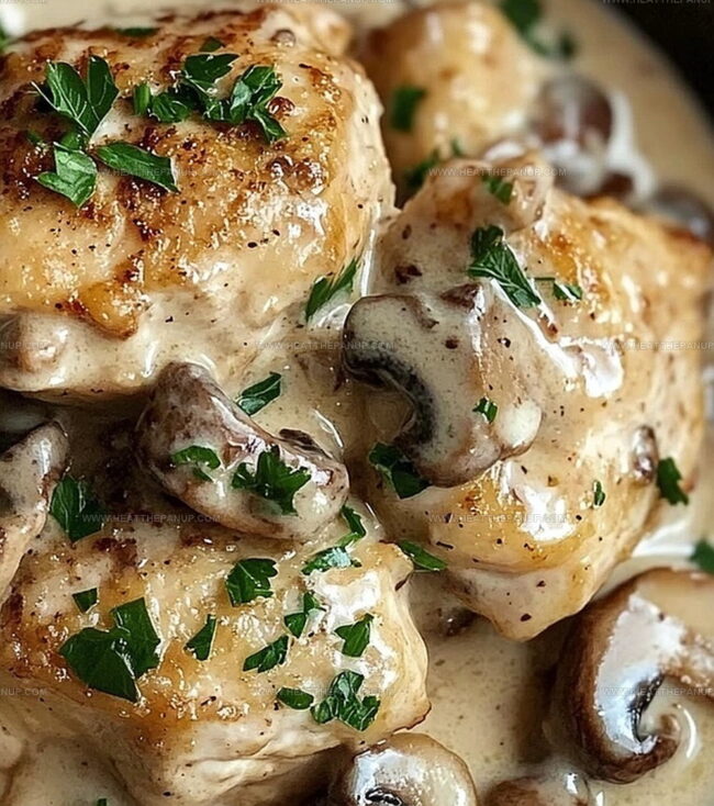 Tender chicken breasts nestle perfectly in a rich, velvety sauce bursting with earthy mushroom goodness.