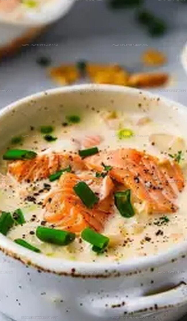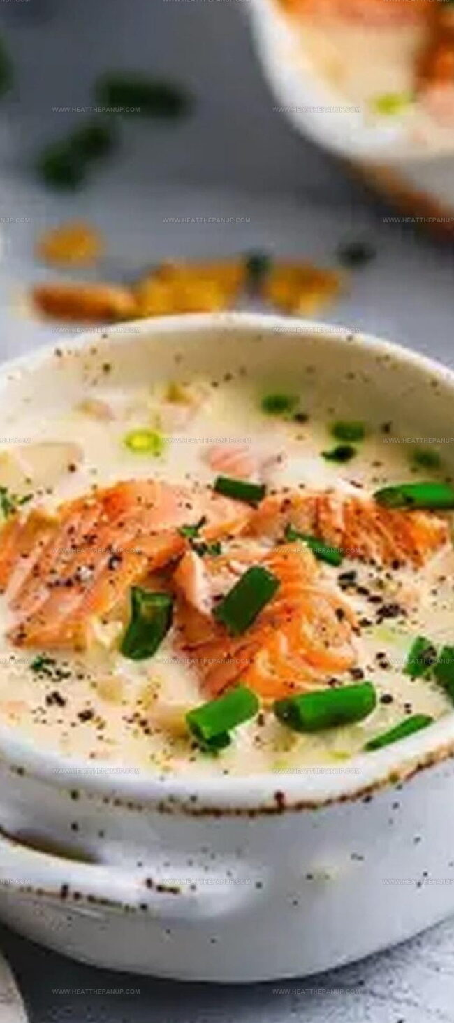 Chunks of tender salmon peek through a silky broth, promising warmth and satisfaction.