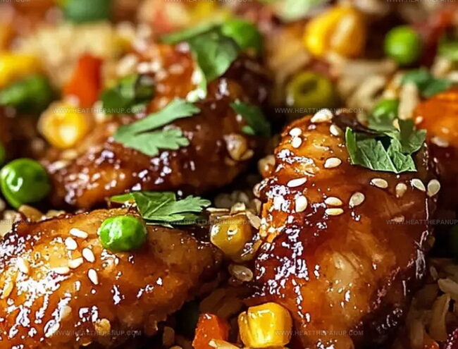 - Plate the vibrant fried rice alongside the glistening saucy chicken.