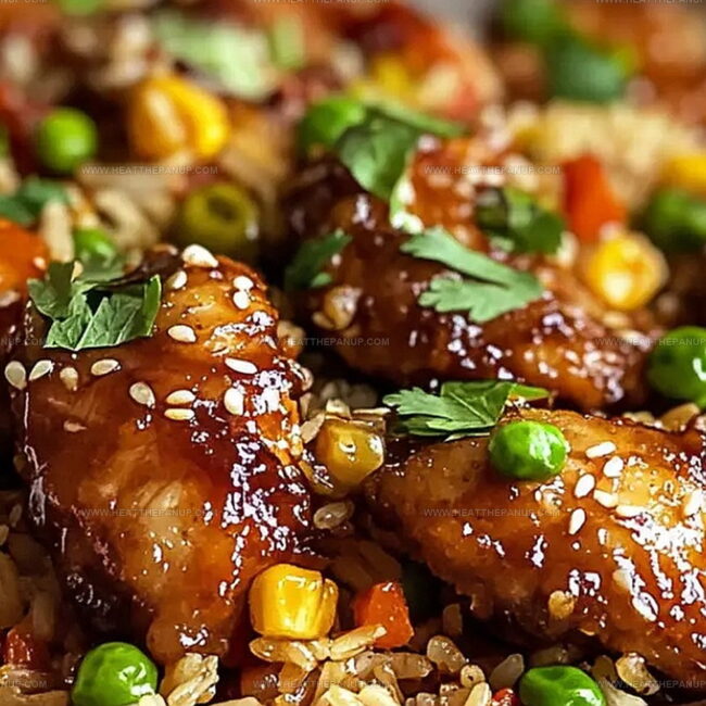 Crispy saucy chicken dances with fragrant vegetable fried rice, creating a symphony of Asian-inspired flavors. Golden chicken pieces nestled alongside colorful vegetables promise a delightful meal that brings restaurant-quality comfort directly to your plate.