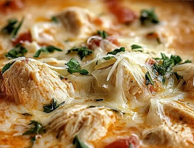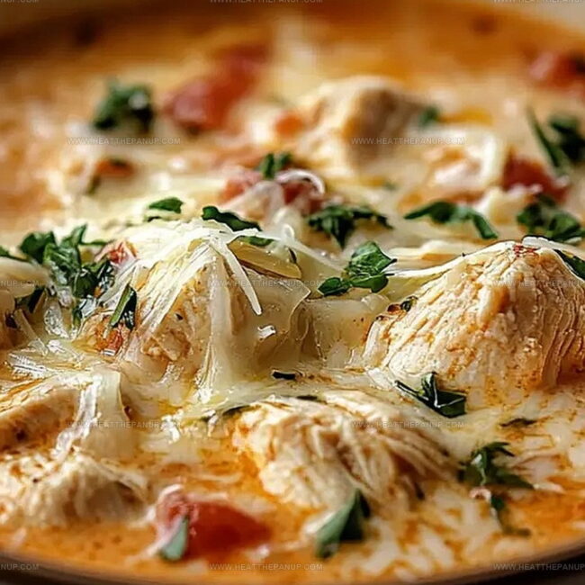 Soft chicken pieces blend seamlessly with rich, velvety broth that hints at classic Italian traditions.