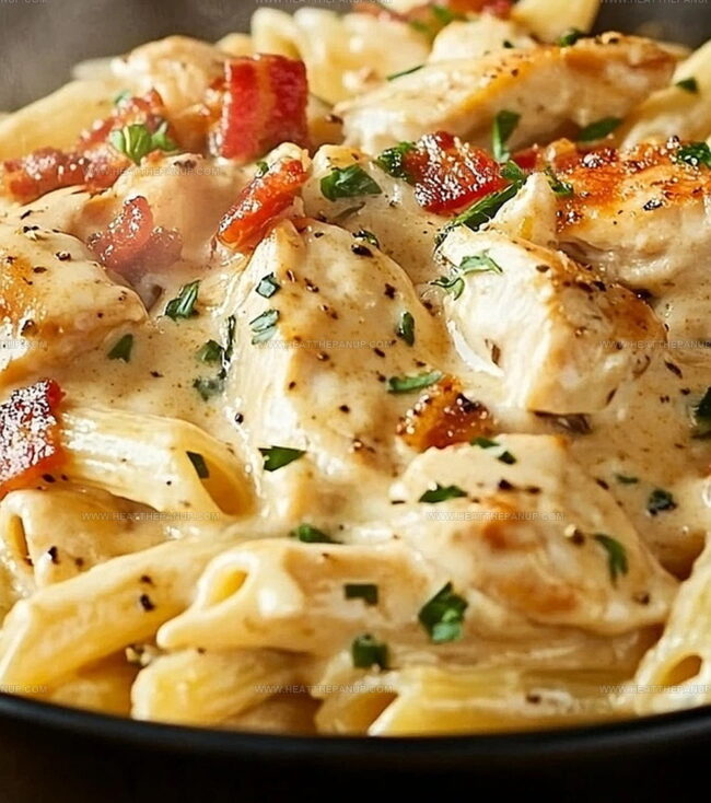 - Enhance the sauce by folding in Parmesan cheese, vibrant red bell pepper pieces, and crispy crumbled turkey bacon.