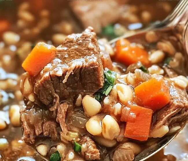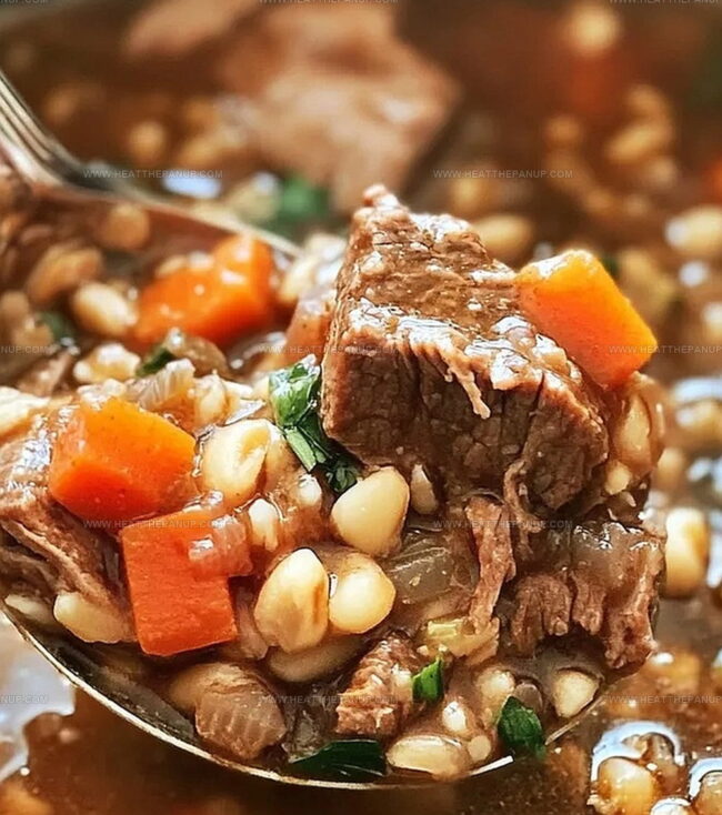 Rich, savory broth mingles with chunks of tender meat and plump barley kernels.
