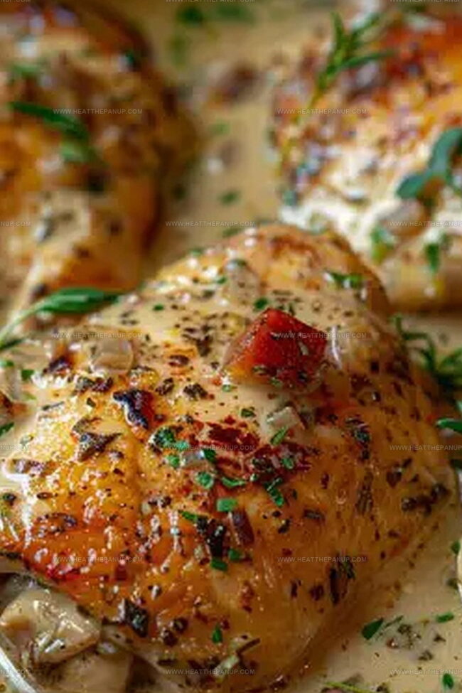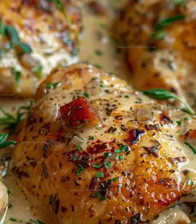 Tender chicken pieces nestle in a creamy, herb-infused sauce that whispers romantic promises.
