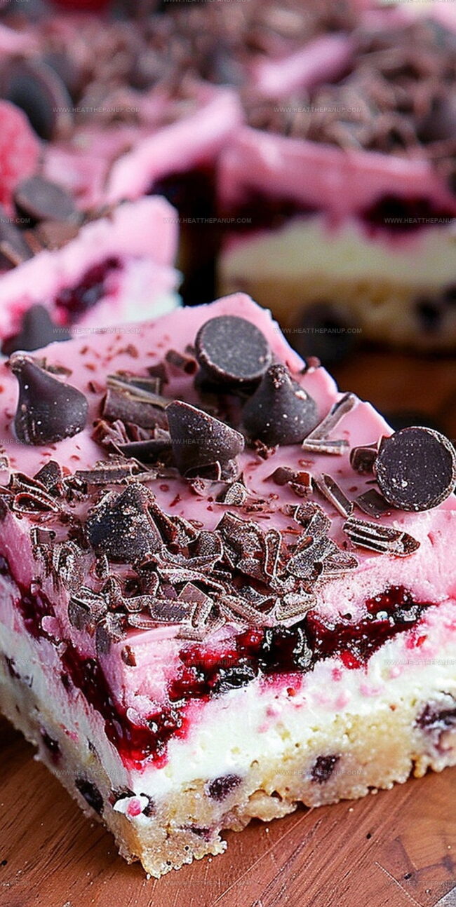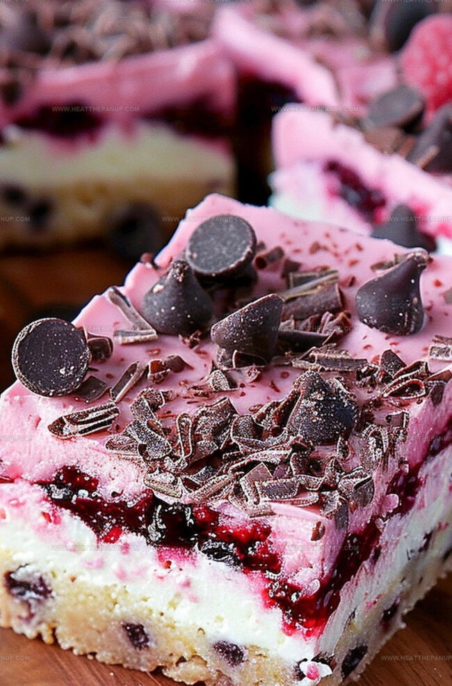 Distribute dark chocolate chips evenly across the raspberry layer, promising rich and decadent bites.