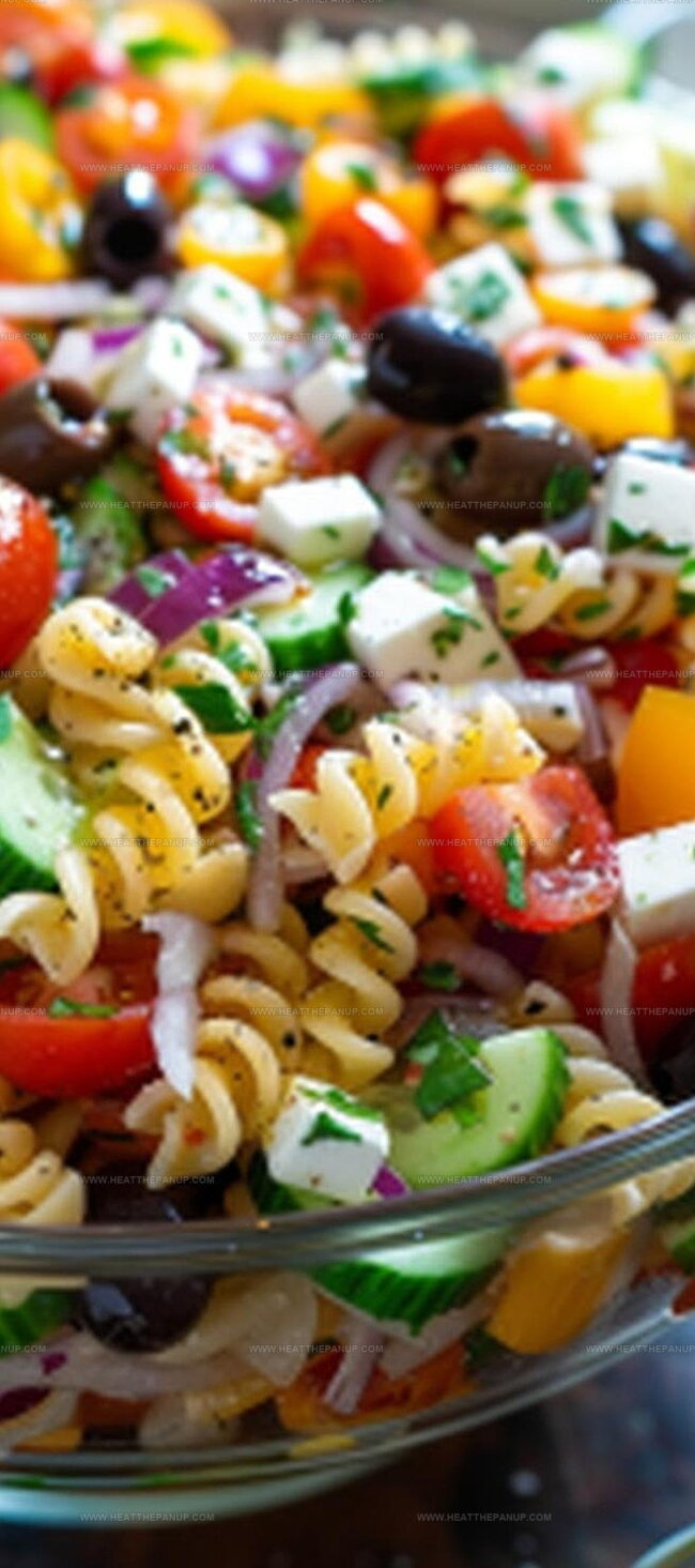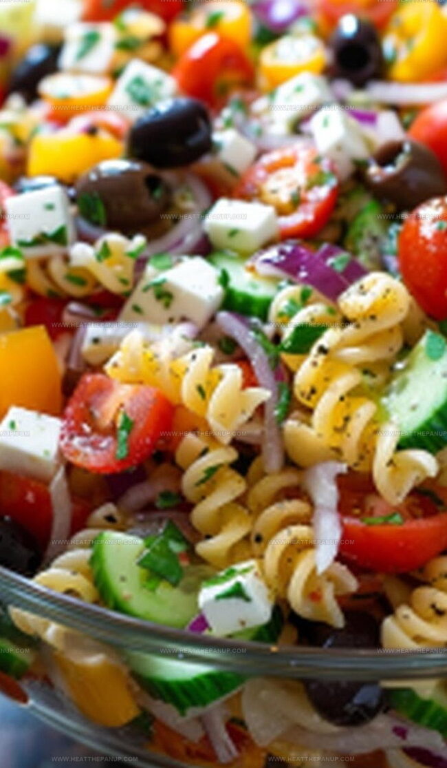 Refrigerate pasta salad for minimum one hour. This allows flavors to mingle and develop a more intense taste profile. Serve cold and enjoy the burst of Mediterranean-inspired freshness.