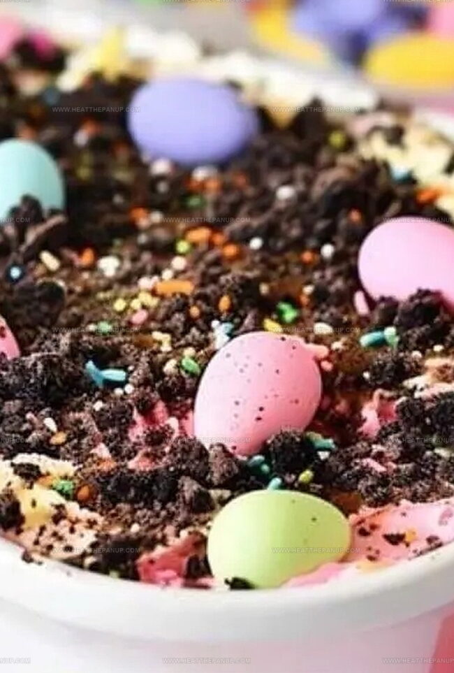 The layered dessert mimics a fun “dirt” landscape with crushed Oreos representing soil, cream cheese mixture adding richness, and chocolate pudding creating depth. Gummy worms and candy eggs complete the playful Easter theme.