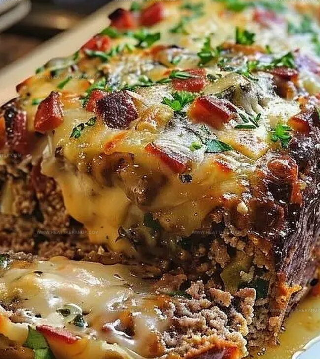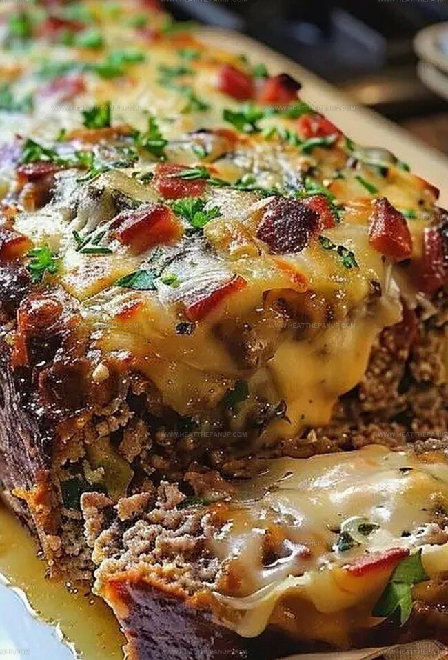 - Slice and serve the meatloaf, revealing the melted cheese center and rich, aromatic layers.