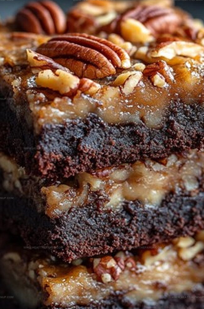 These brownies feature a signature coconut-pecan topping that originates from German’s Sweet Chocolate brand, creating a rich, decadent dessert with a unique caramel-like coating that sets them apart from traditional chocolate brownies.