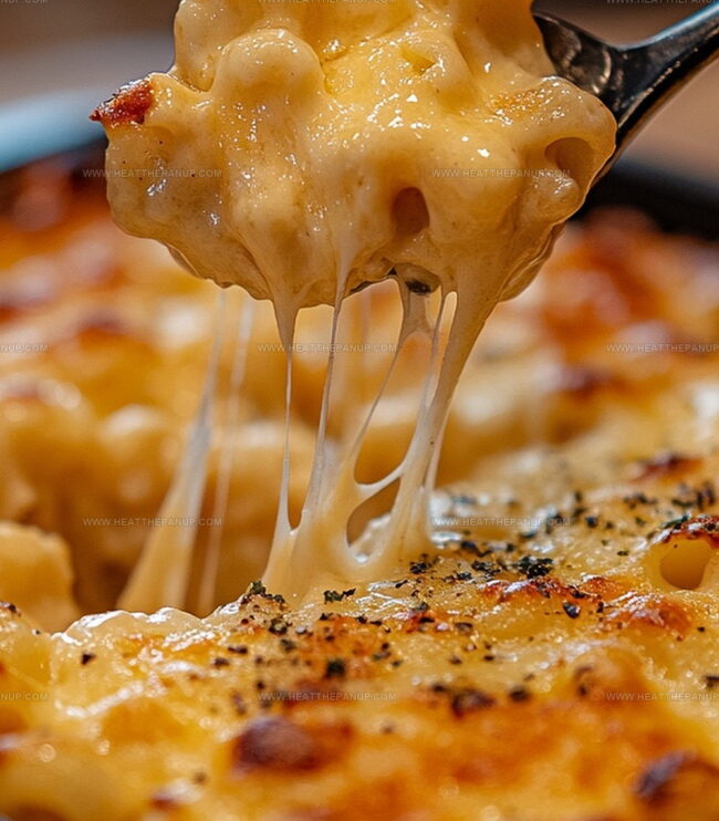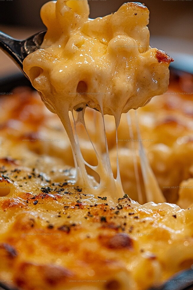 Tender pasta nestles beneath a golden, bubbling blanket of rich cheese sauce.