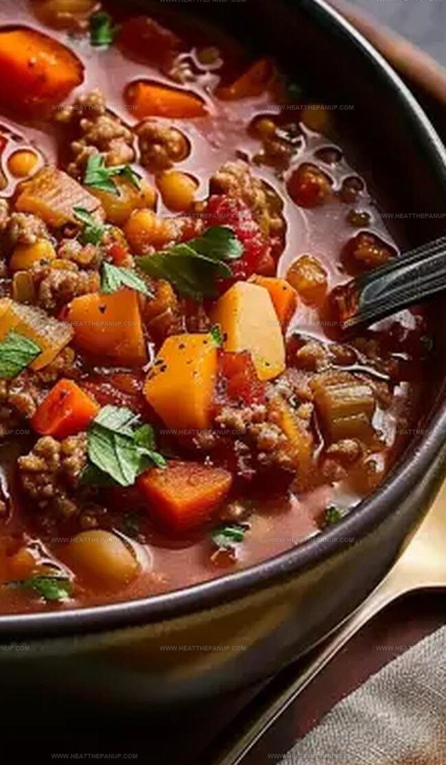 This recipe combines traditional beef soup elements with the heartiness of hamburger ingredients. The addition of barley and multiple herbs creates a unique, comforting flavor profile that sets it apart from standard beef soups.