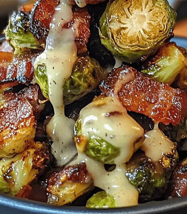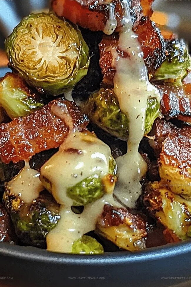 - Transfer Brussels sprouts to a serving dish, drizzle with prepared glaze, and generously scatter crumbled bacon on top.