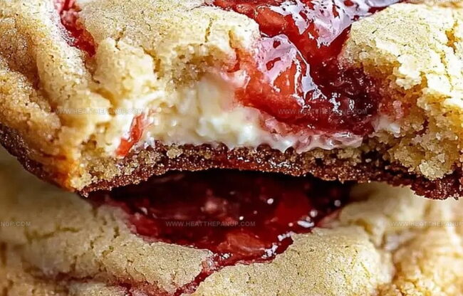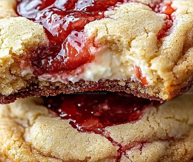 The filling is a delightful blend of tangy cream cheese and sweet strawberry jam, creating a luscious, creamy center that perfectly complements the cookie’s texture.