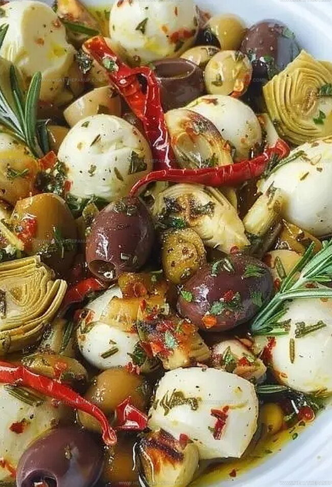 - Incorporate artichoke hearts, mozzarella balls, and assorted olives into the liquid mixture, carefully folding to ensure each ingredient is thoroughly and evenly coated with the herbal dressing.
