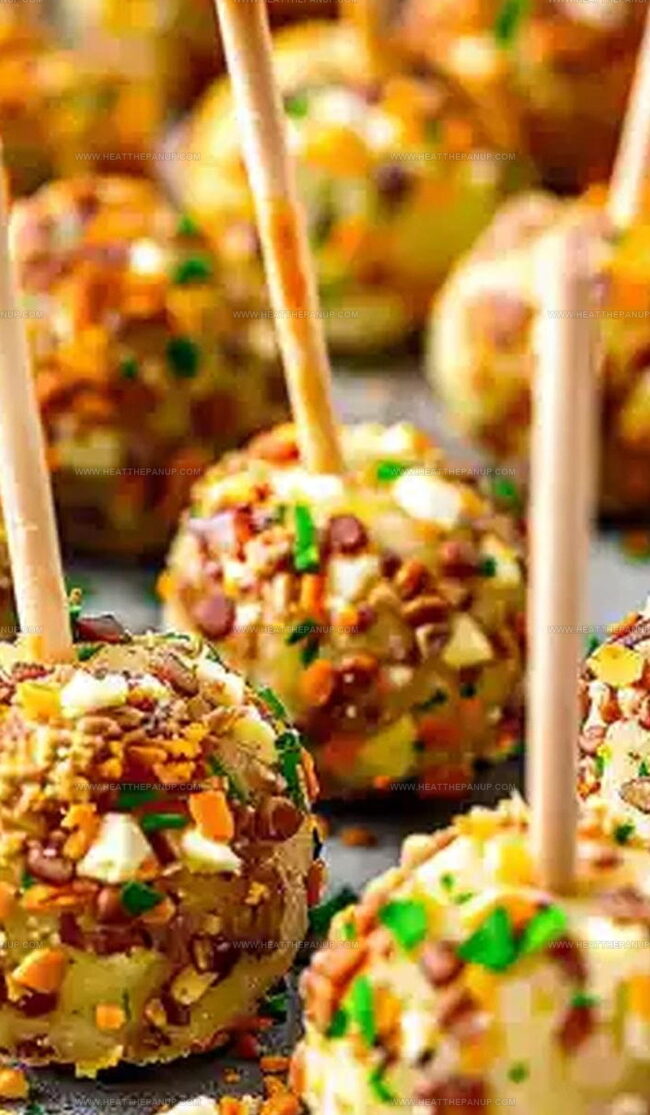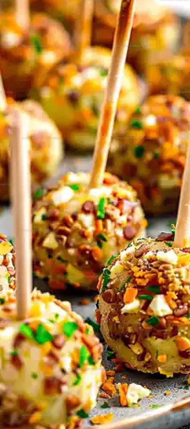 - Just before presentation, puncture each cheese ball with a crisp pretzel stick, positioning it slightly off-center for an elegant, inviting appearance.