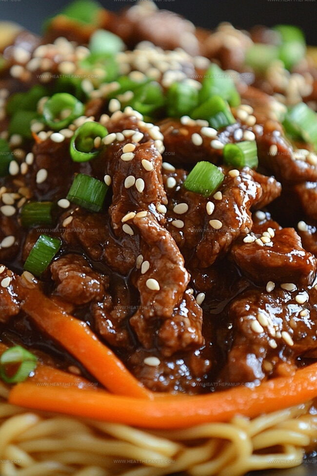 - Plate the dish by spreading ramen noodles as a base, then generously top with the Mongolian beef mixture. Finish with a sprinkle of chopped green onions and a delicate shower of sesame seeds for added texture and visual appeal.