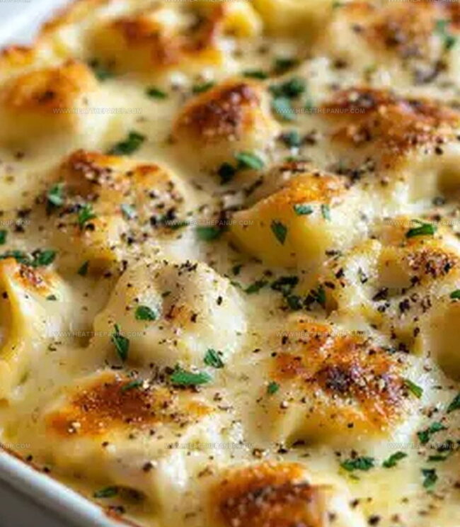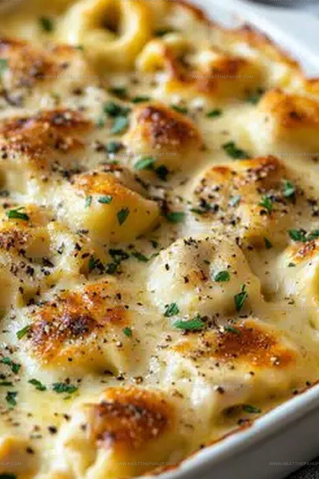 - Cook tortellini according to package instructions, ensuring perfect al dente texture. Transfer the pasta to a 2-quart baking dish, generously coating each piece with the velvety Alfredo sauce.
