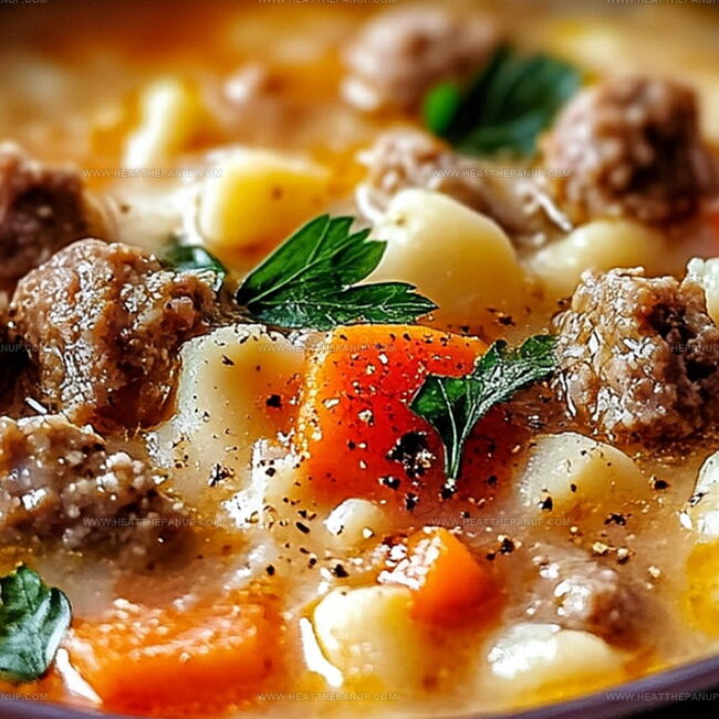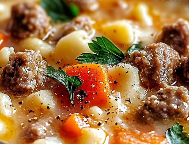Meat lovers and soup enthusiasts will appreciate the rich, satisfying blend of ground beef and pasta swimming in a creamy broth.