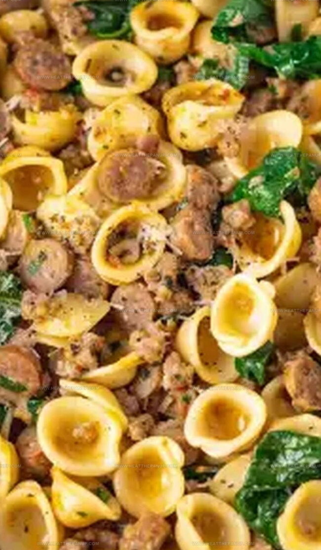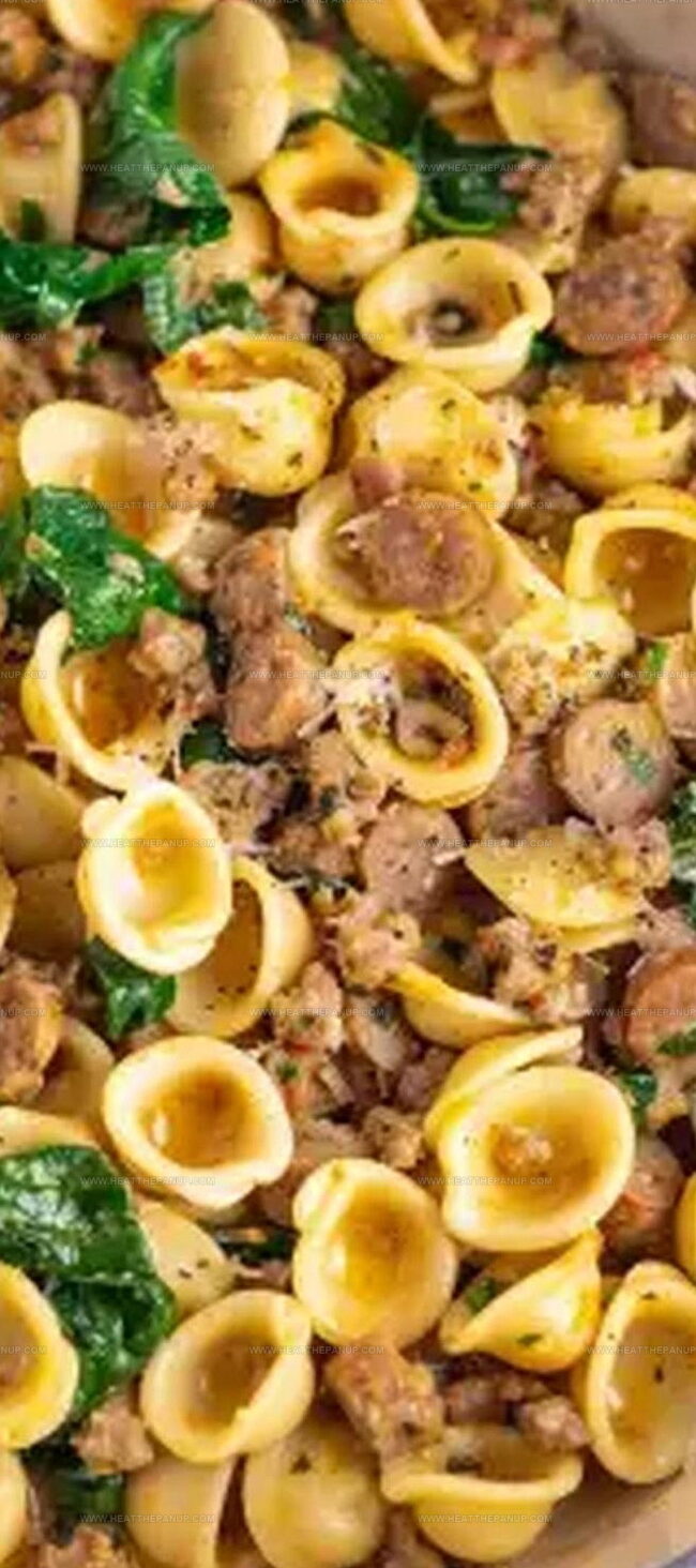 Tender ear-shaped pasta cradles savory chunks of Italian sausage, creating a symphony of flavors in each bite.