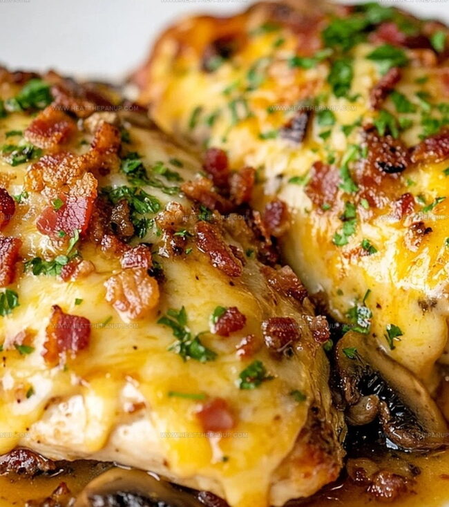Spread those sautéed mushrooms and crispy turkey bacon over each chicken breast.