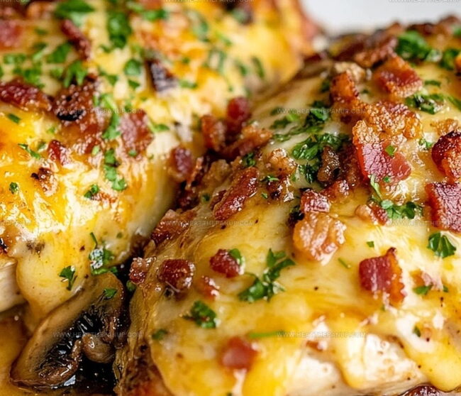 - Layer the seared chicken with sautéed mushrooms and crispy turkey bacon.