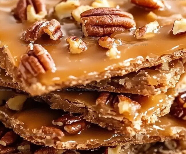 - Carefully verify that pecans are uniformly distributed and each cracker segment is completely coated with the rich, amber-hued mixture.