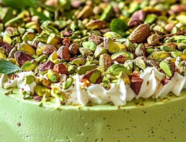 - Embellish cake top and edges with finely crushed pistachios for textural contrast and visual appeal.