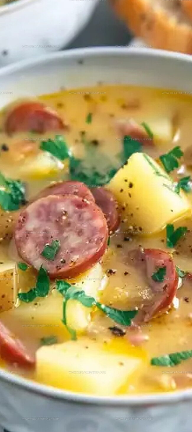 Chunks of tender potatoes swim alongside savory kielbasa, promising warmth in every spoonful.