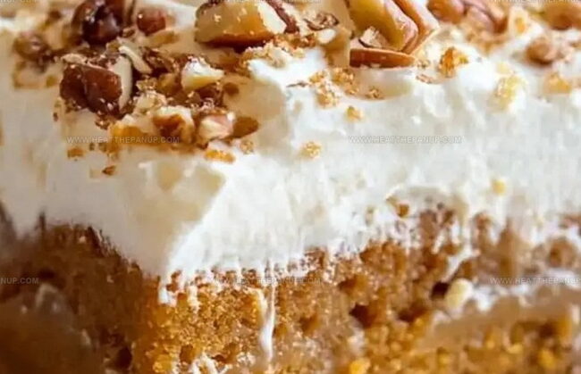 Topped with pillowy whipped cream, this pumpkin poke cake transforms an ordinary afternoon into a celebration of seasonal delights.