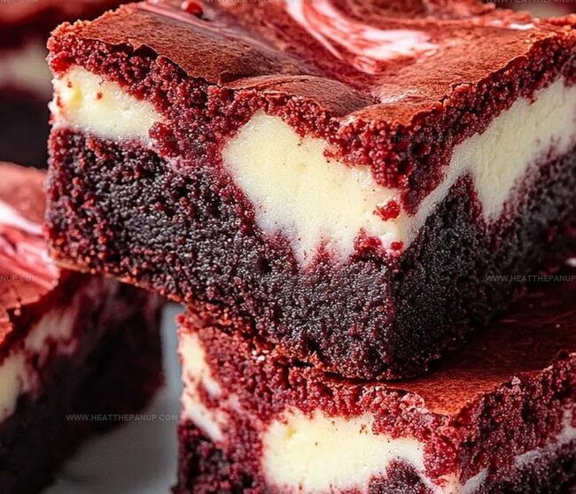 Rich red velvet cheesecake swirl brownies bring luxurious dessert magic to chocolate lovers’ tables. Marbled cream cheese layers dance through intense cocoa depths, promising indulgent bliss with each luscious chocolate-packed bite you’ll savor.