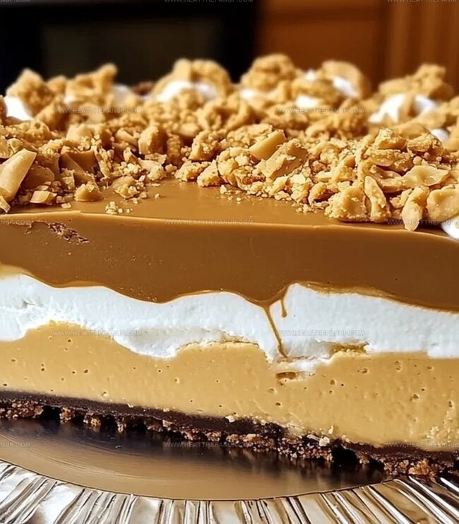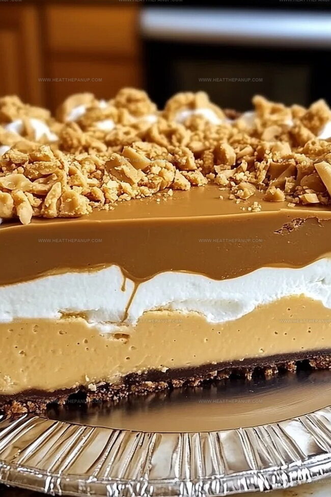 - Distribute the first half of peanut butter crumbles across the pre-baked pie crust, creating a textured base layer. Pour the peanut butter pudding mixture evenly over the crumbles, then crown with a generous layer of whipped cream.