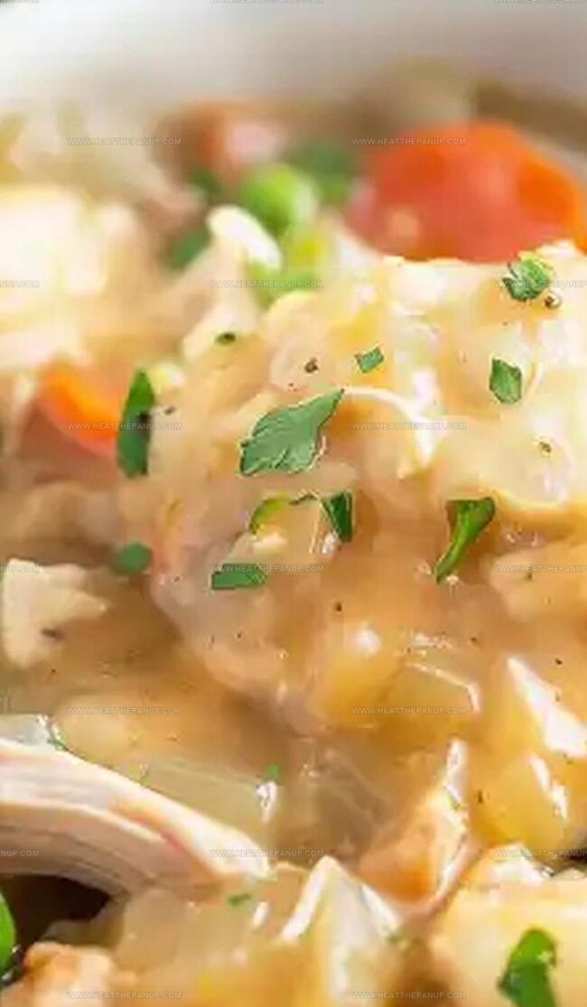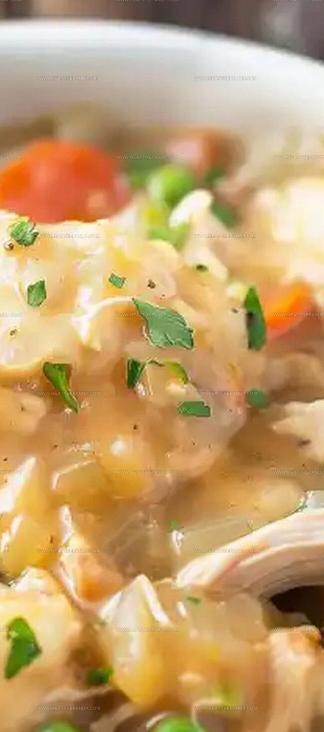 Comfort arrives with this soul-warming slow cooker chicken and dumplings that promises hearty happiness in every spoonful.