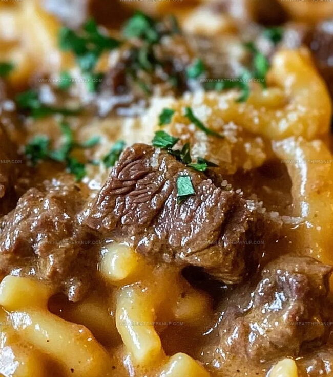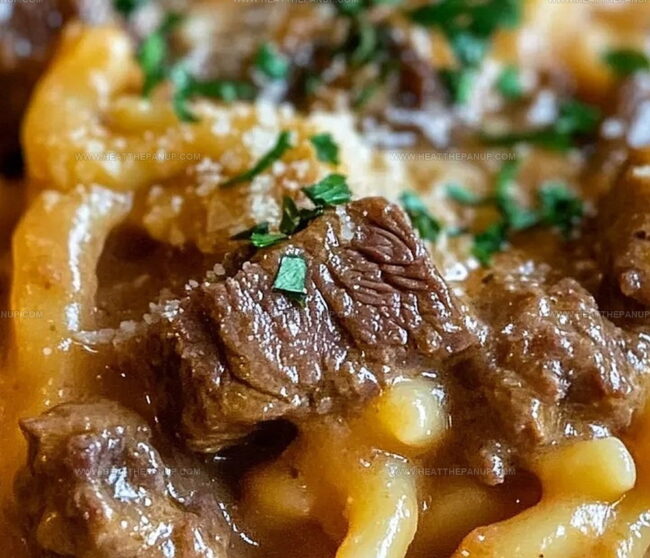 Tender beef melts into a rich, velvety sauce that clings perfectly to each pasta strand.