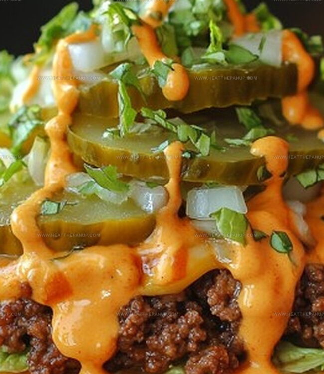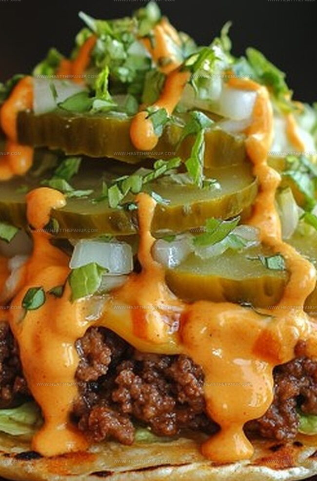 - Construct the final taco by layering burger sauce, crisp lettuce, diced onions, and tangy pickles atop the cooked patty.