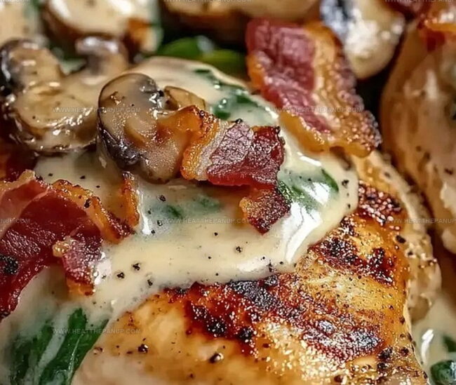 Creamy and indulgent, this smothered chicken recipe with creamed spinach, turkey bacon, and mushrooms brings a luxurious twist to your dinner table.