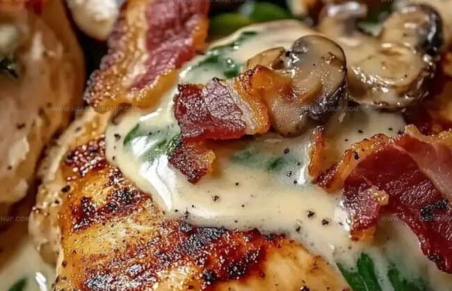 Succulent Smothered Chicken delights palates with tender meat nestled among creamy spinach, crisp turkey bacon, and earthy mushrooms. Comfort meets culinary elegance in this hearty dish that promises to satisfy deep hunger and warm kitchen memories.