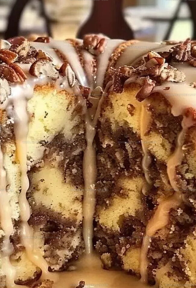 The filling combines brown sugar, cinnamon, and chopped pecans, creating a sweet and nutty layer that adds texture and flavor between the cake batter, giving the cake a delightful surprise in every bite.