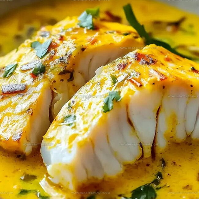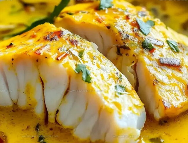 Delicate cod fillets nestle perfectly in a creamy, golden sauce infused with saffron’s luxurious essence.